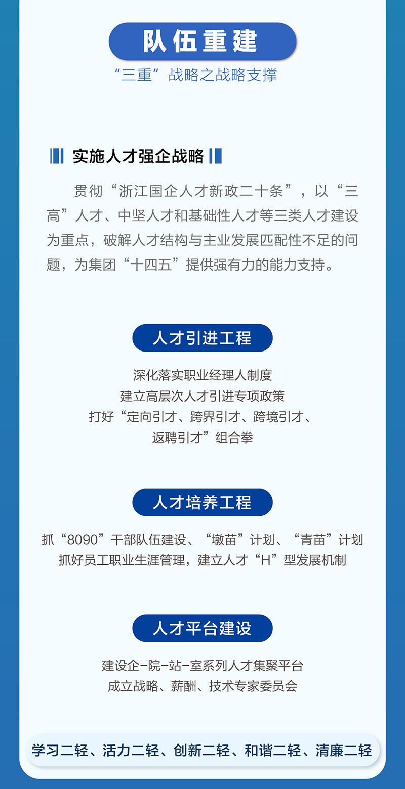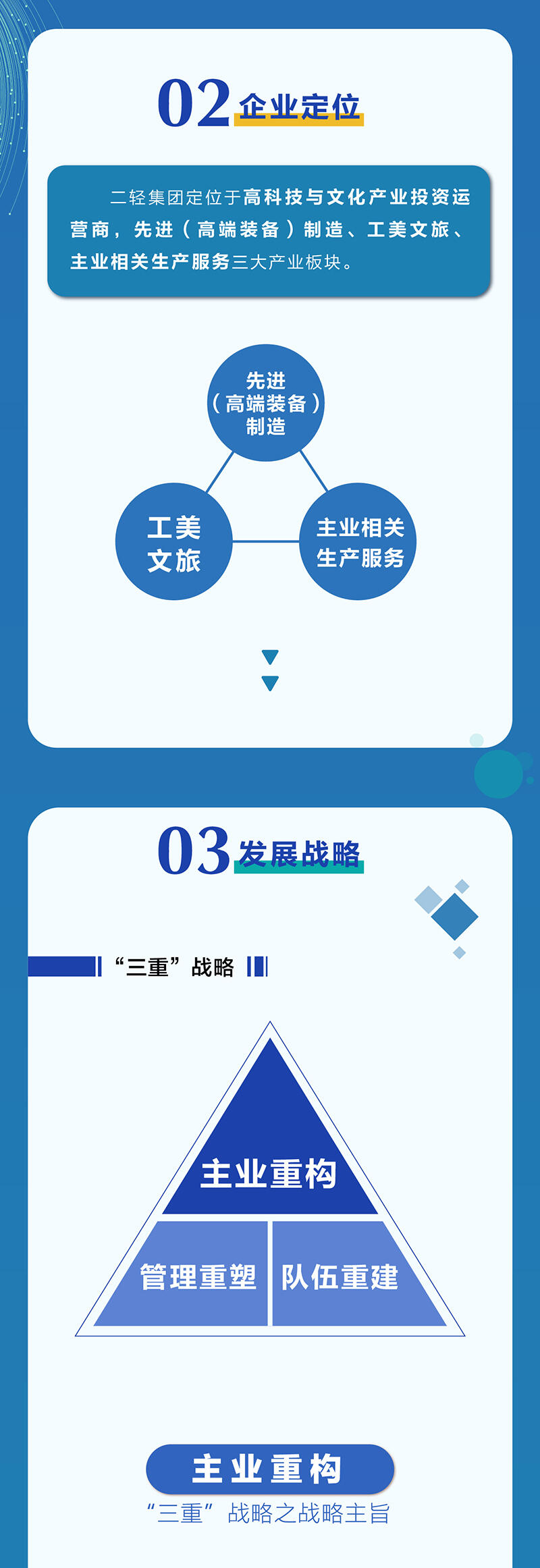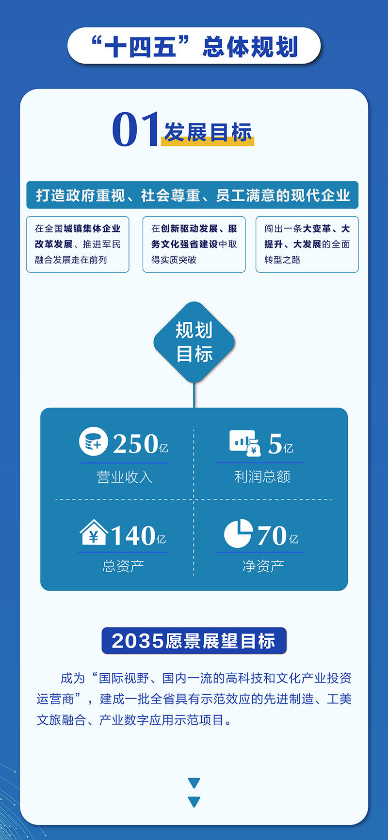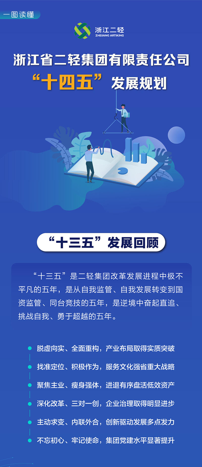 展望“十四五”,二轻集团将坚持以“文化立命、实业立身、党建塑魂、科技赋能”为主线,努力践行集团公司第一次党代会确定的“混改强基、两轮驱动、适度多元”的发展战略,进一步聚焦主业、明确定位,大力打造制造业、工美文旅业两大主业,全面推动深化改革、提升管理、资本运作、科技创新、人才强企、强化治理和党建引领等各项工作,多措并举、综合施策,力争通过三至五年时间,使二轻集团在全国城镇集体企业改革发展方面、创新驱动发展方面、军民融合发展方面和文化强省建设方面走在前列,为浙江建设“重要窗口”展示二轻担当、贡献二轻力量。