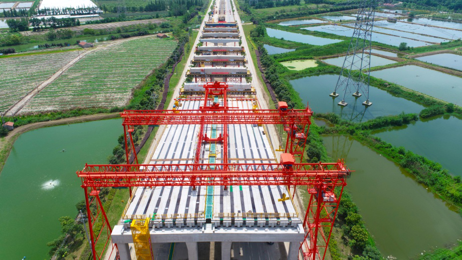 在全国首条智慧高速——杭绍甬高速杭绍段项目的建设现场,工人们正在进行“精确操作”,长25米,宽1.7米,重约70吨的T梁经起吊、对位、落梁等高难度动作,像“搭积木”一样被稳稳安放在桥墩上。这种施工方式被称作建筑工业化施工,因现场拼装提前做好的预制构件,与常规的现场浇筑施工相比,施工效率大大提升,仅单片梁板架设施工时间就可缩短1个月。