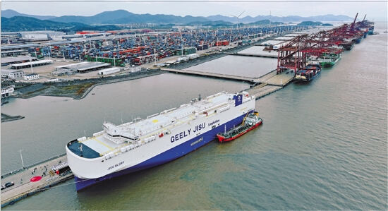 9月21日,在宁波舟山港梅西滚装码头,3000多辆汽车有序驶入“吉速荣耀”号LNG双燃料滚装船,自此,吉利控股集团旗下吉速物流的自营滚装船正式投入运营。“吉速荣耀”号从宁波舟山港始发,可直抵欧洲多个核心港口,进一步拓展了中国汽车出口的国际物流通道。图为等待发船的“吉速荣耀”号。 本报记者 王凯艺 通讯员 夏传熙 夏文杰 摄