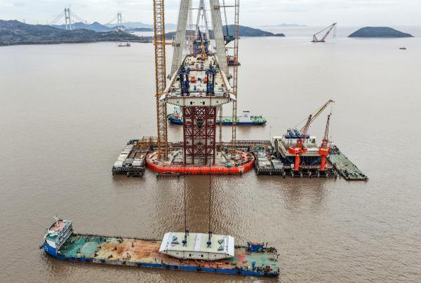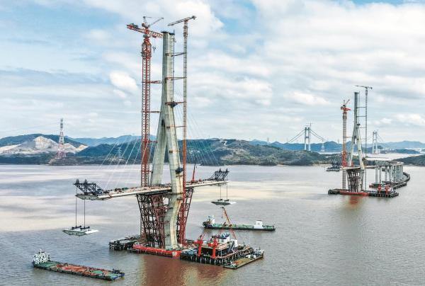 近日,宁波舟山港六横公路大桥二期关键控制性工程——青龙门特大桥施工现场,三座主塔巍然矗立,Q4号主塔两榀钢箱梁同步吊装作业,一派“比翼双飞”的繁忙景象。