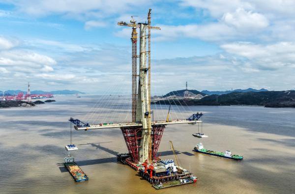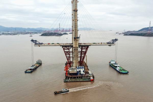 青龙门特大桥横跨青龙门水道,连接佛渡岛与梅山岛,是宁波舟山港六横公路大桥二期项目的核心工程,线路全长5.864公里。其中,通航孔桥全长2212米,双主跨均为756米,是世界跨度最大的三塔钢箱梁斜拉桥。
