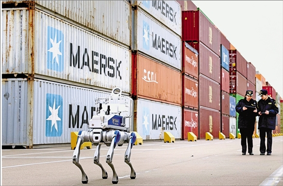“机器狗既有‘火眼金睛’,又有‘智慧大脑’。”梅山海关物流监控二科副科长张建说,通过事先规划空箱堆存布局与预设最优巡检路线,机器狗能自主完成查验场地覆盖巡查,自动寻找、核对集装箱号并拍照回传,实现精准定位与信息采集。